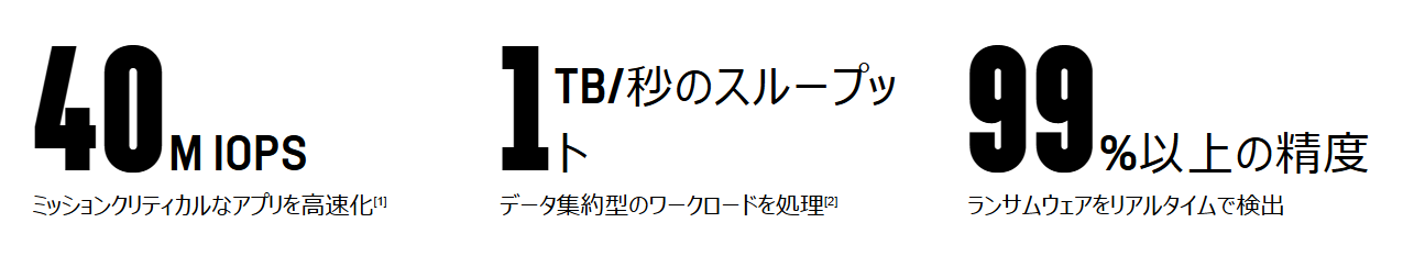 最大4,000万IOPS、1TB/秒のスループットと優れた拡張性を備えた新しいAFF Aシリーズ システムなら、ビジネスを推進するミッションクリティカルなワークロードも簡単に強化できます。また、AIや生成AIのワークロードにも対応しているので、組織の技術革新と生産性も加速できます。