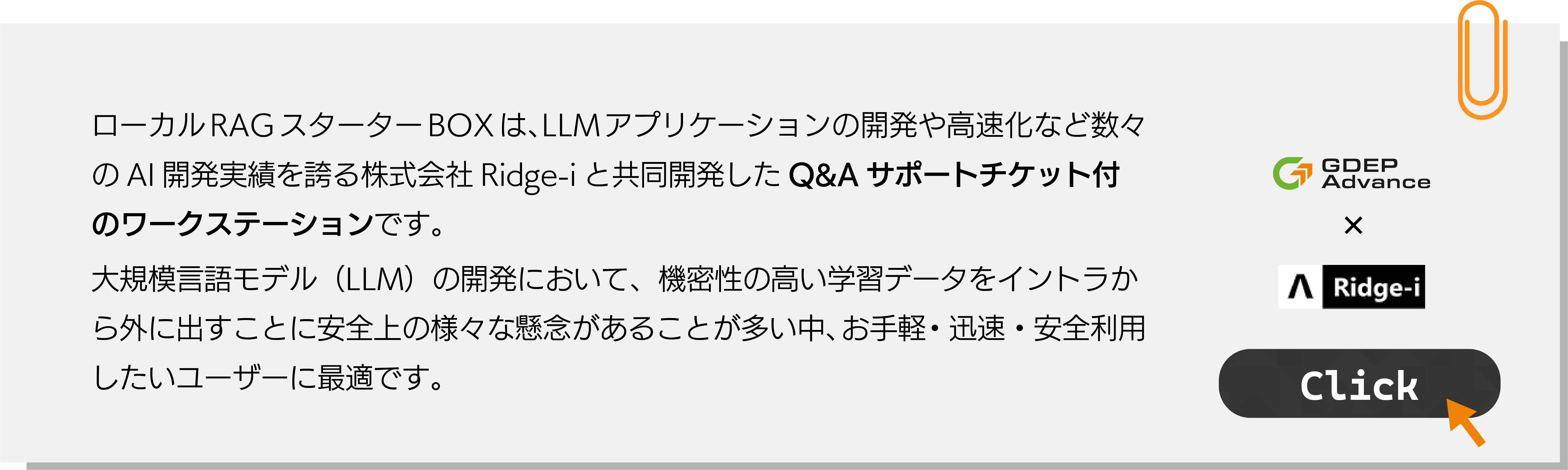 GPUのGDEPchevron_right ソリューションラインナップ chevron_right サービス・ソリューション chevron_right ハードウェアソリューション chevron_right ローカルRAGスターターBOXローカルLLM・RAG開発